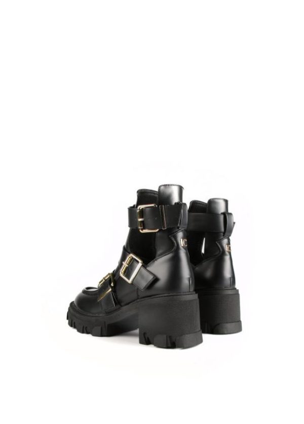 Botín en efecto piel con caña semi abierta y suela track con maxi hebillas doradas. Detalle logo dorado en parte trasera.