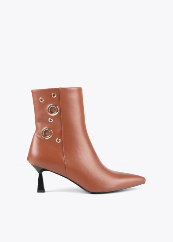 Botín de tacón efecto piel. Cierre con cremallera lateral y detalles de ojales dorados. Logo metalizado en parte trasera. Acabado en punta.