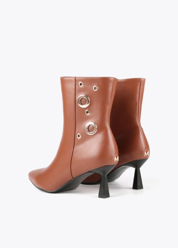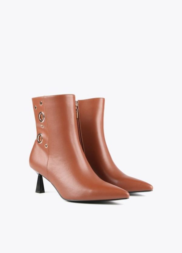 Botín de tacón efecto piel. Cierre con cremallera lateral y detalles de ojales dorados. Logo metalizado en parte trasera. Acabado en punta.