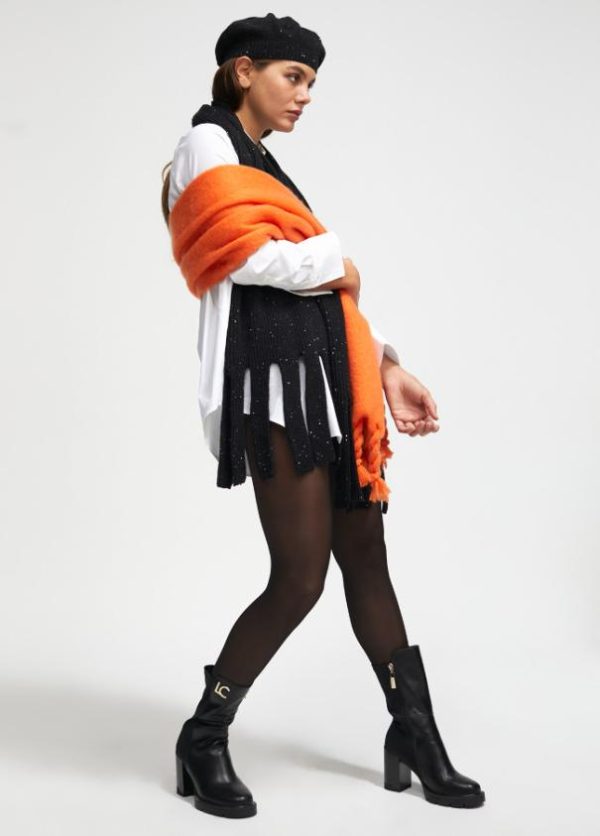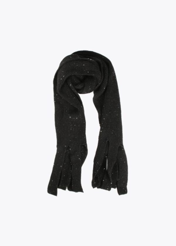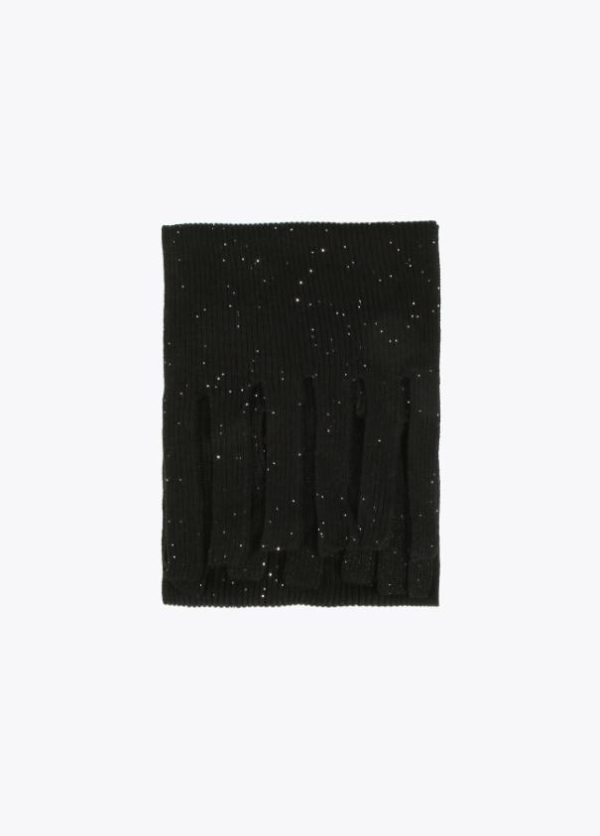 Bufanda ancha en color negro con mini lentejuelas al tono. Flecos en extremos del mismo tejido.