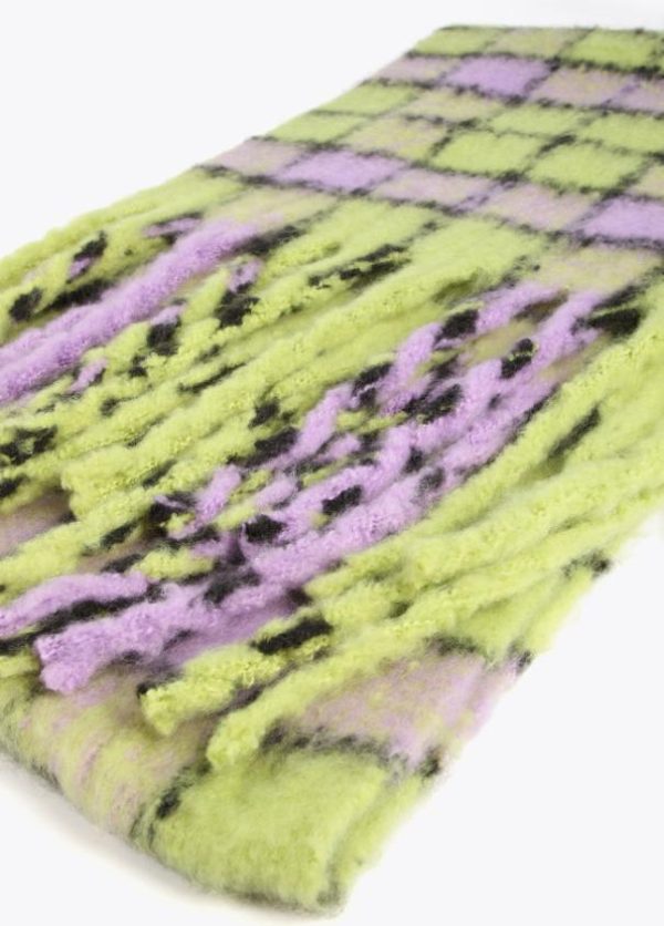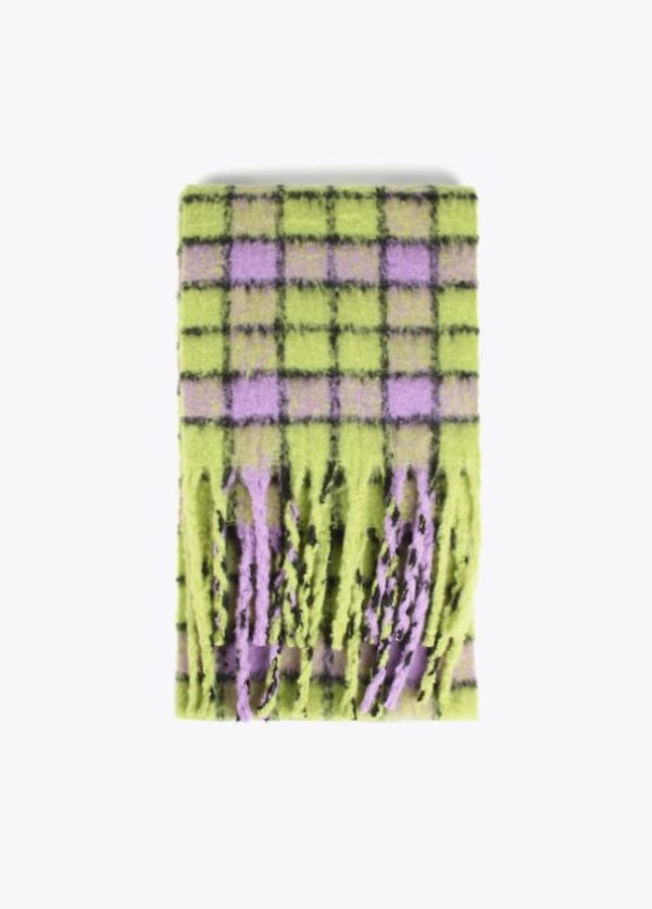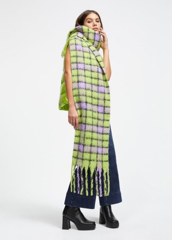 Bufanda de cuadros en diferentes colores combinados y logo grabado sobre efecto piel.