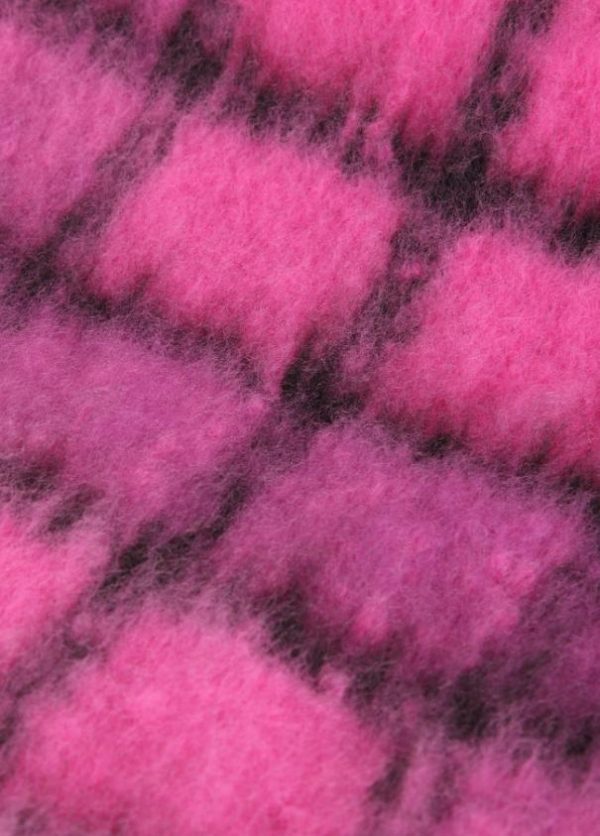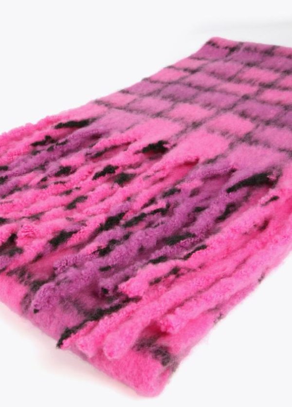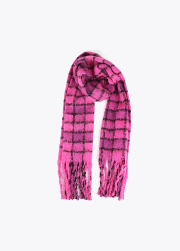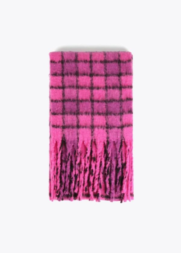 Bufanda de cuadros en diferentes colores combinados y logo grabado sobre efecto piel.