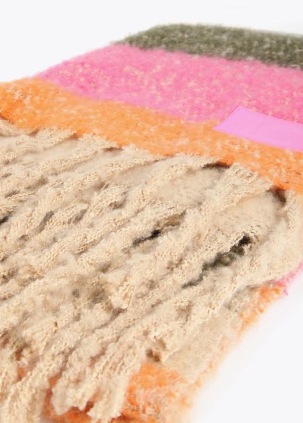 Bufanda de rayas gruesas multicolores con flecos en los extremos.