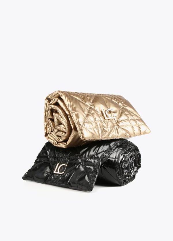 Cuello de nylon acolchado con letras logo doradas en parte frontal.