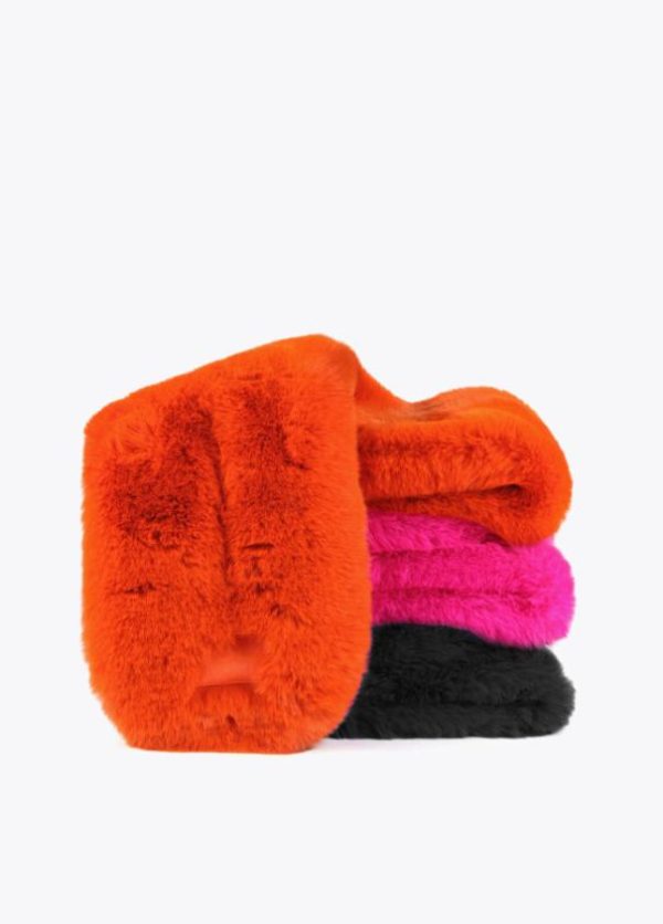 Cuello efecto pelo de color con logo grabado sobre efecto piel.