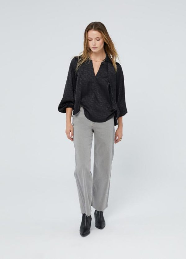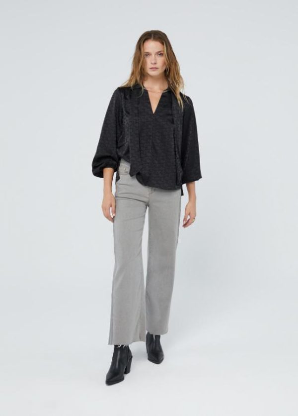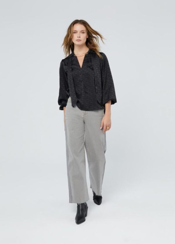 Blusa de tejido logotipado a tono. Con escote pico y lazo del mismo tejido, estampado y color. Mangas ligeramente abollonadas con puños elásticos.