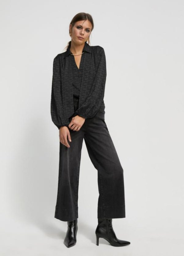 Blusa de tejido logotipado a tono. Con escote pico y lazo del mismo tejido, estampado y color. Mangas ligeramente abollonadas con puños elásticos.