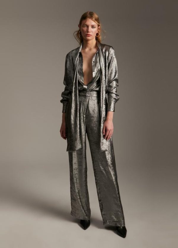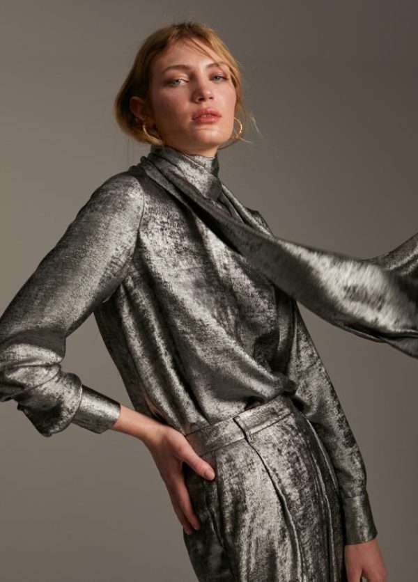Blusa con efecto laminado. Lazada en cuello del mismo tejido. Puños camiseros. Cerrada con botones bajo tapete.