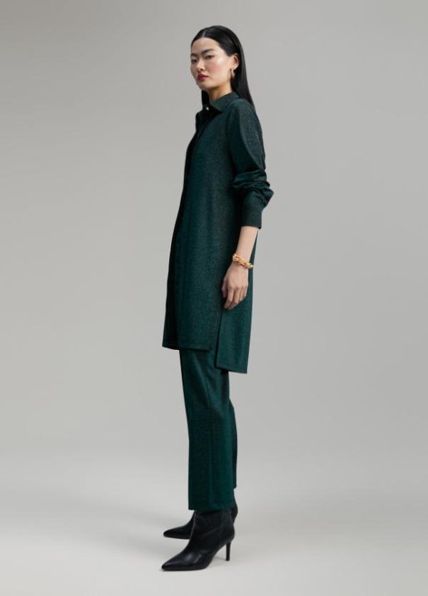 Blusón largo de punto con lúrex. Cuello camisero y cerrado con botones frontales y en puños. Aberturas laterales en bajo.