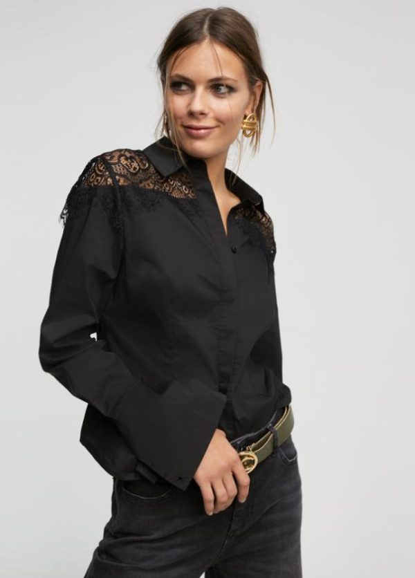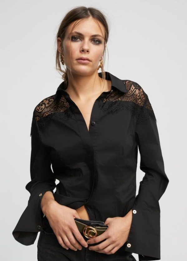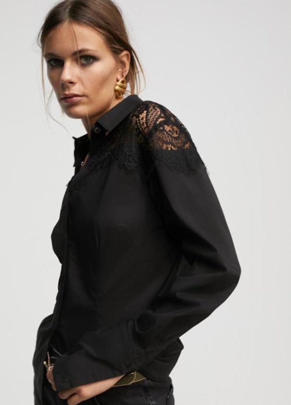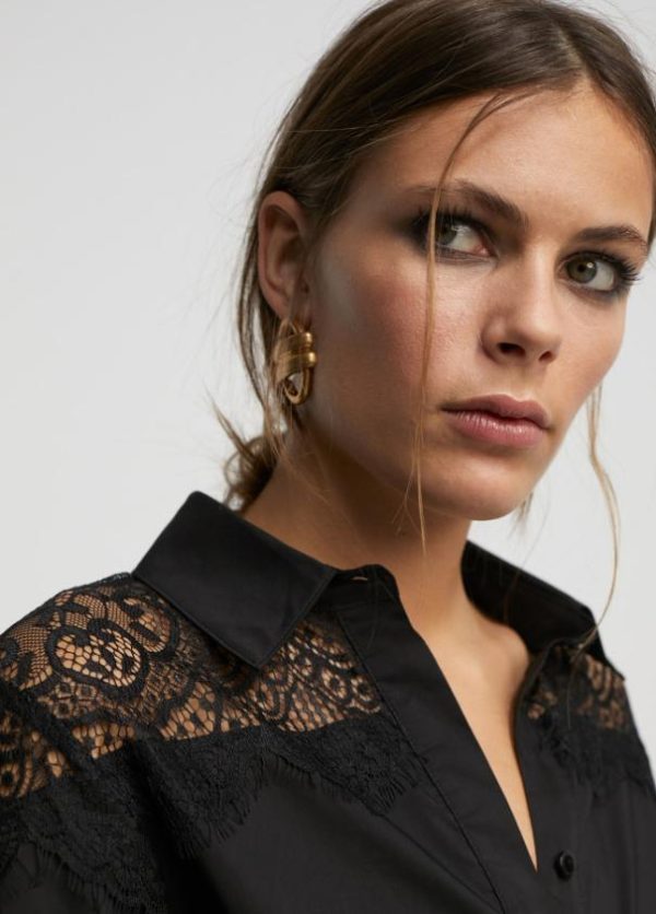 Camisa de cuello y puños camiseros. Cierre con botones ocultos por tapete. Detalle de encaje a tono en frontal, hombros y parte superior espalda.