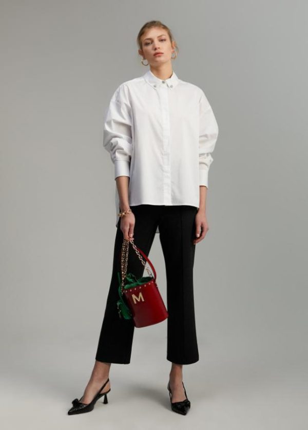 Camisa recta de cuello y puños camiseros. Detalle de joya en cuello y primer botón. Cerrada con botones ocultos bajo tapete.
