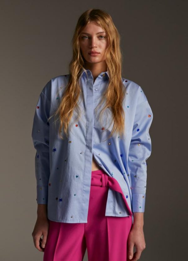 Camisa con detalle joyas multicolor. Cuello y puños camiseros. Cerrada con botones ocultos por tapete. Bajo asimétrico.