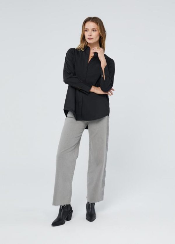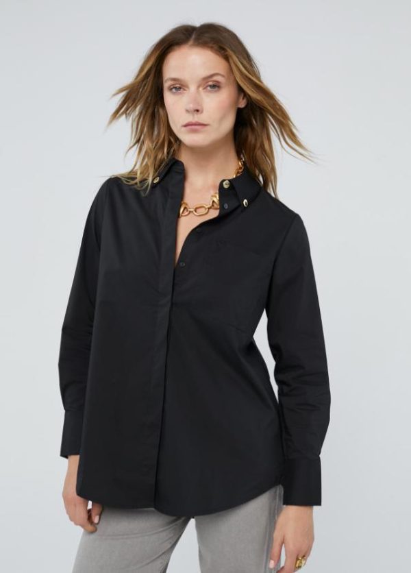 Camisa con botón metálico en cuello. Puños camiseros. Cerrada con botones bajo tapete. Pliegue en espalda con detalle logo a contraste.