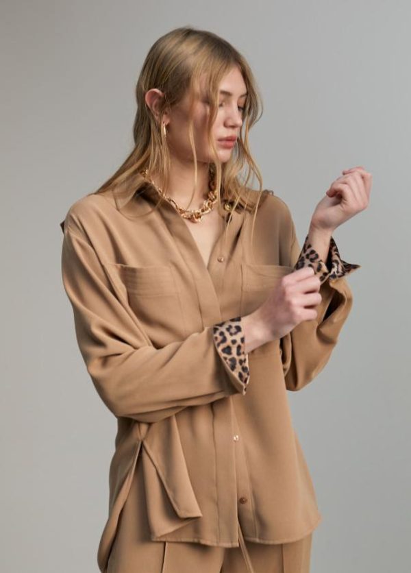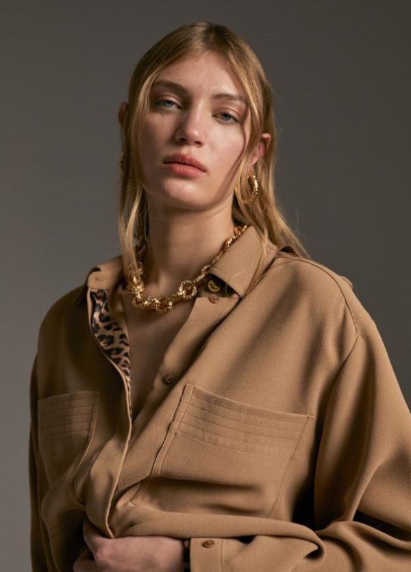 Sobrecamisa oversize de cuello camisero y manga larga acabada en puño. Detalle de pinza en espalda y bolsillos plastrón en frontal superior. Cierre con botones y estampado animal en forro interior.