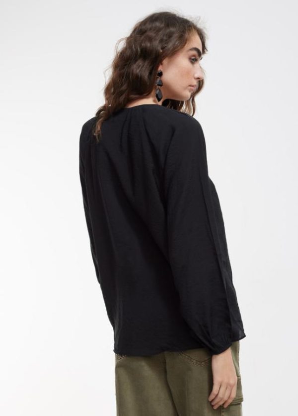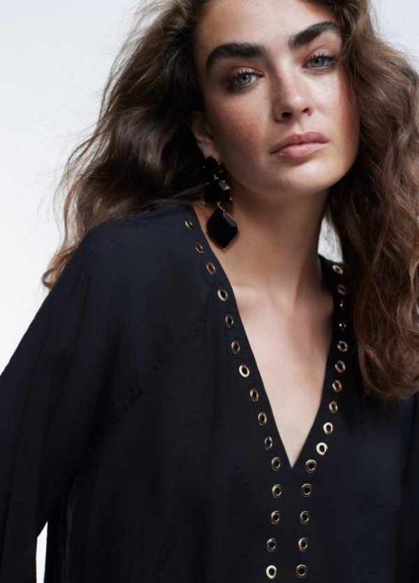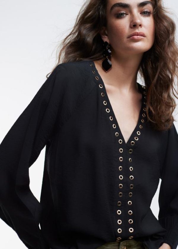 Blusa fluida con escote pico. Detalle de eyelets metálicos en frontal. Mangas ligeramente abollonadas con puños elásticos.
