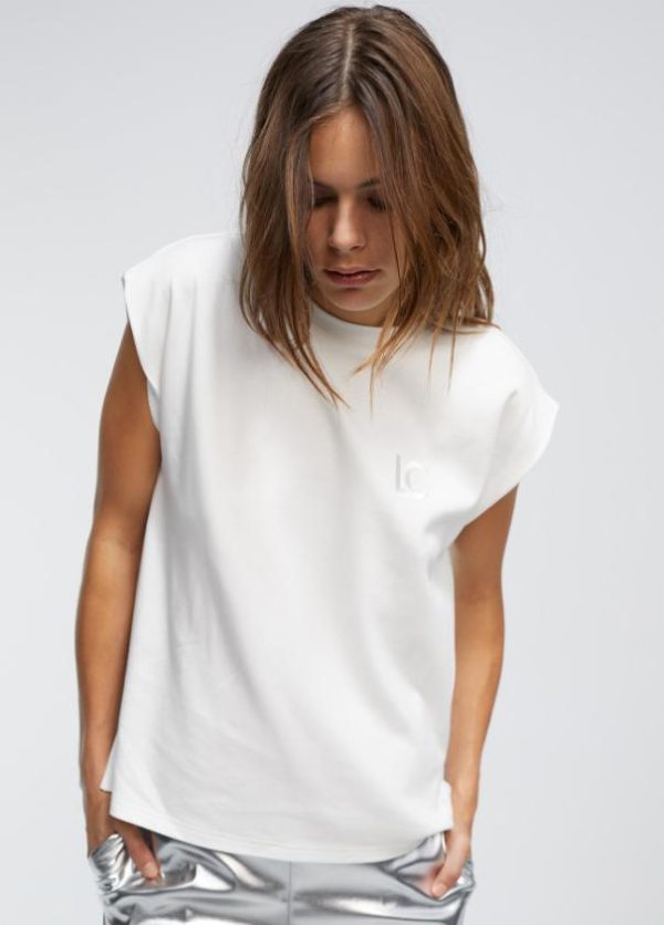 Camiseta cuello caja y manga caída. Detalle de logo bordado a tono.
