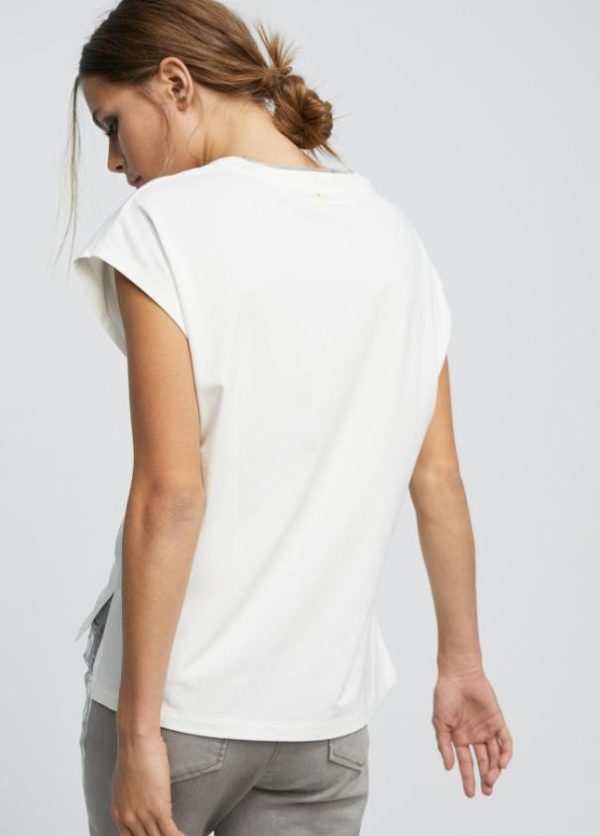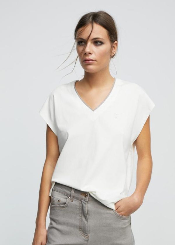 Camiseta en cuello pico y manga sisa. Detalle de cadena mini en cuello.