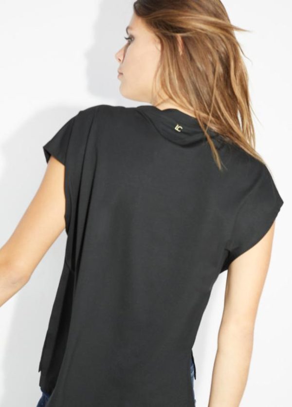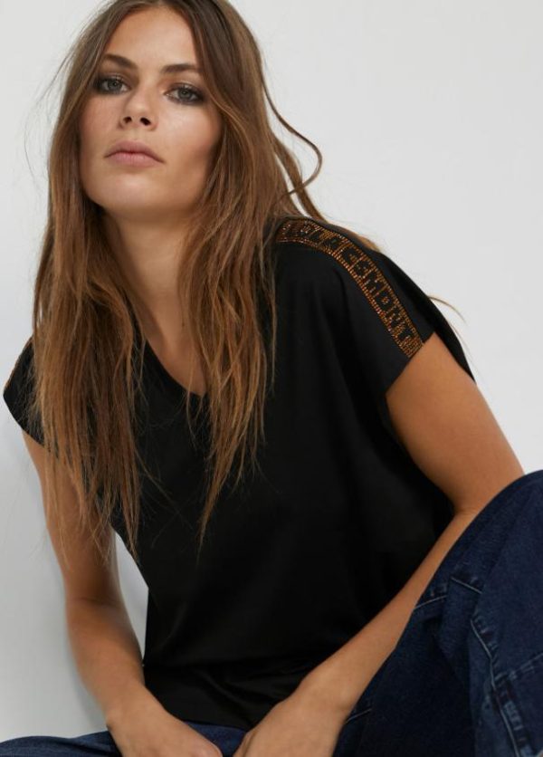 Camiseta de cuello pico y manga caída. Detalle en strass bicolor en hombros.