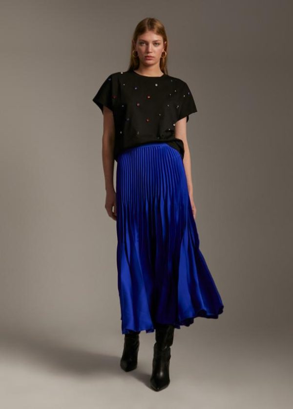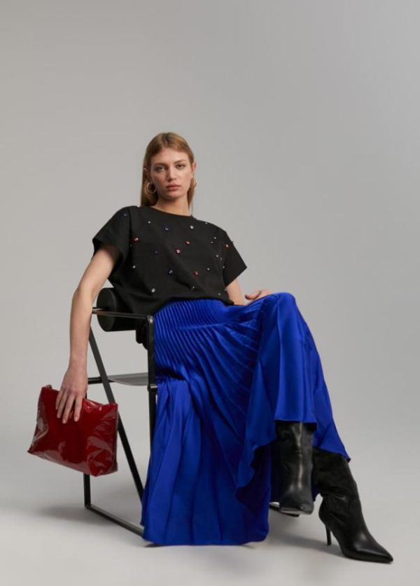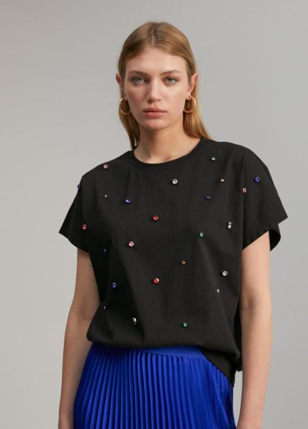 Camiseta recta de manga corta y cuello caja. Detalle de joyas multicolor en frontal.