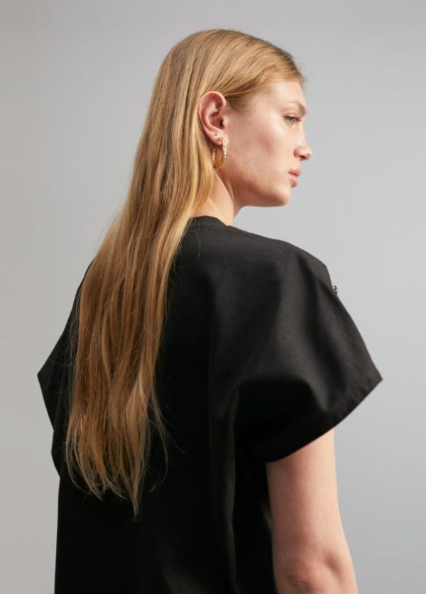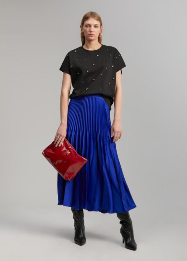 Camiseta recta de manga corta y cuello caja. Detalle de joyas multicolor en frontal.