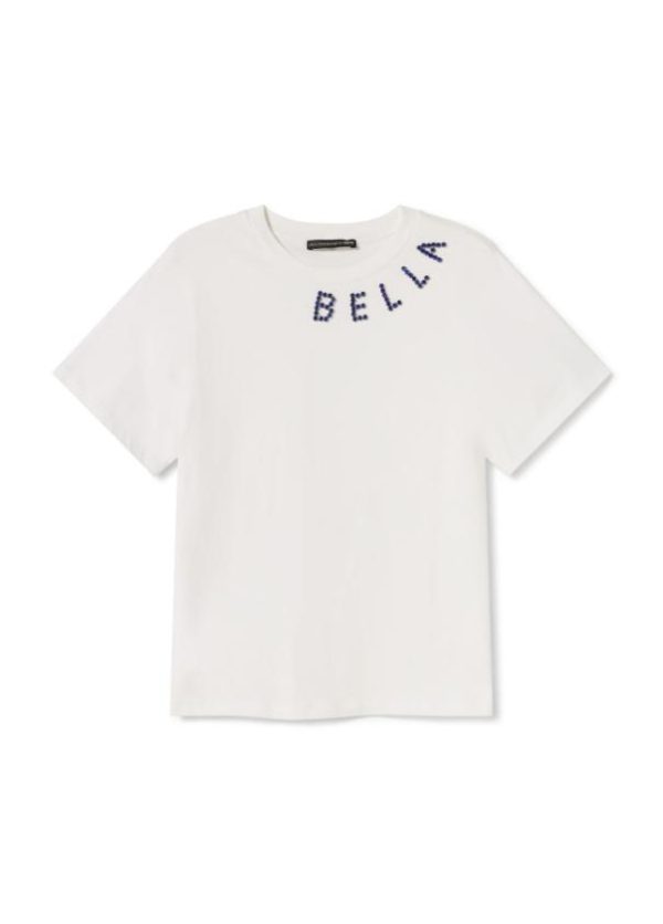 Camiseta de manga corta y cuello caja. Detalle BELLA en pedrería contrastada.