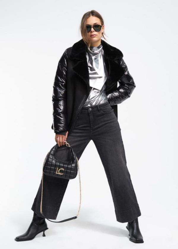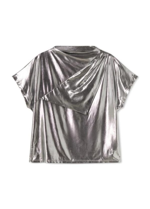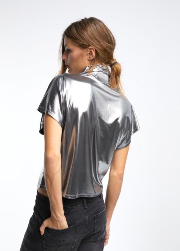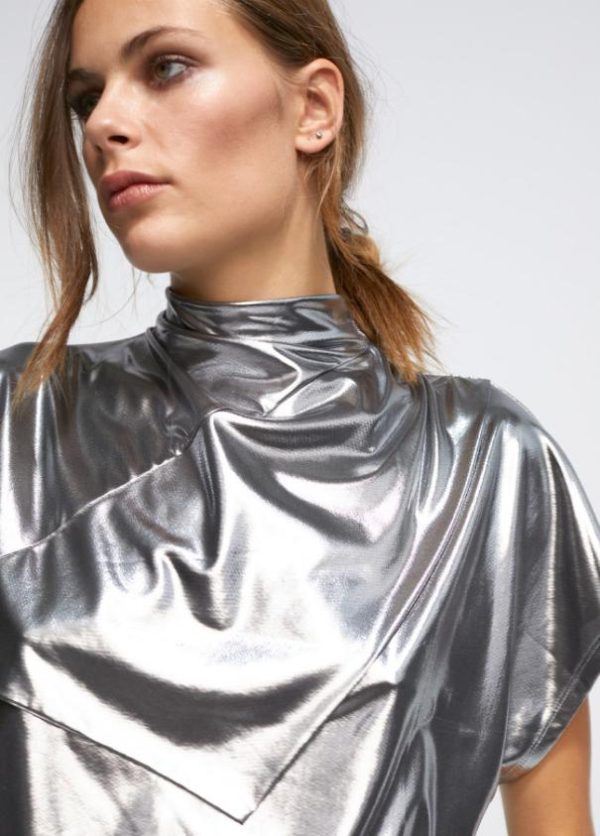 Camiseta de cuello perkins en tejido laminado color plata. Efecto pañuelo en frontal.