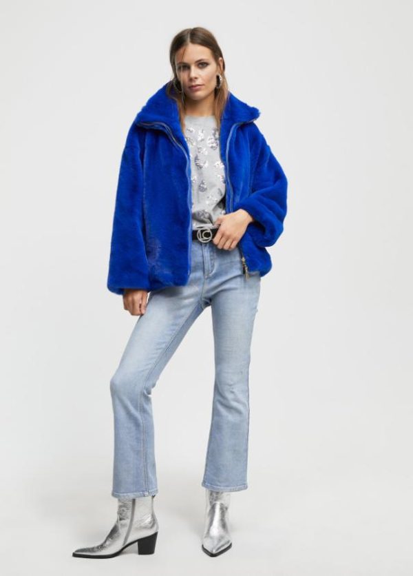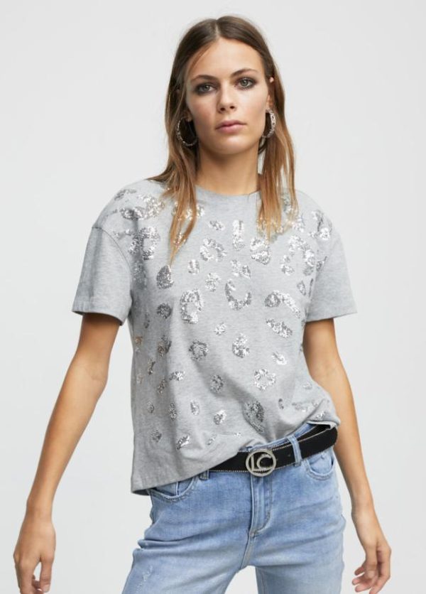Camiseta de manga corta y cuello caja. Detalle de lentejuelas a tono y frontal tipo mancha animal.