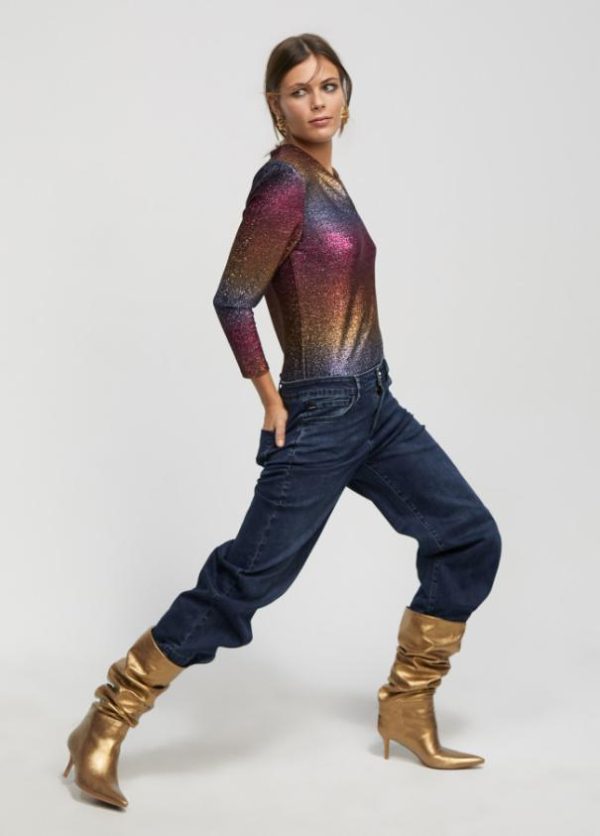 Camiseta con hombreras y cuello pico. Tejido efecto metalizado tricolor.