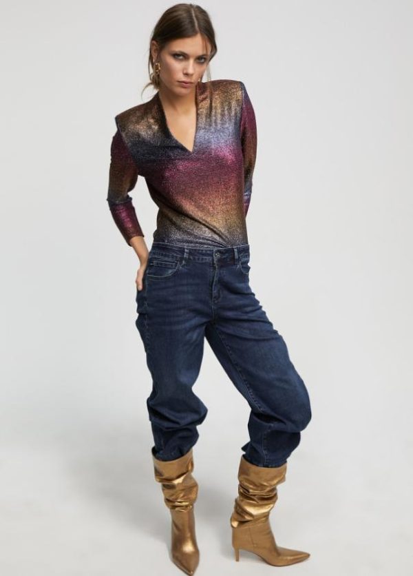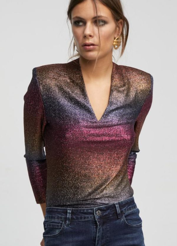 Camiseta con hombreras y cuello pico. Tejido efecto metalizado tricolor.