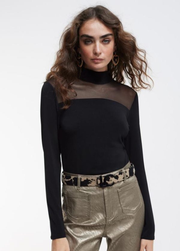 Camiseta de manga larga negra y cuello perkins. Detalle de transparencia en tul frontal en delantero y espalda.