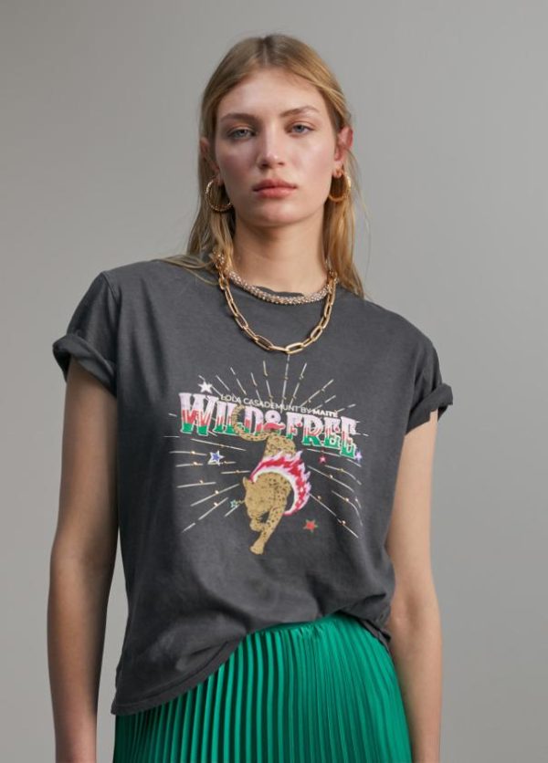 Camiseta efecto desgastado. Manga corta y cuello caja. Posicionado frontal con detalle piezas metálicas.