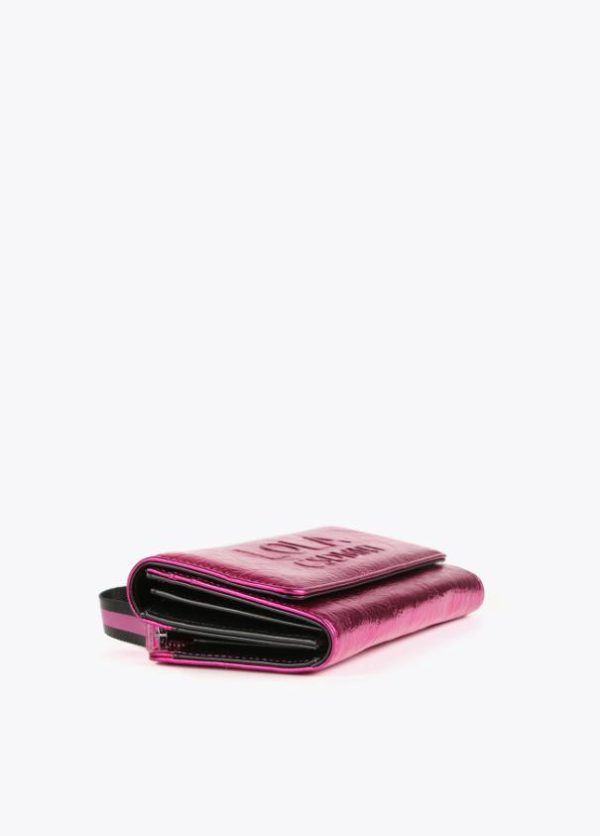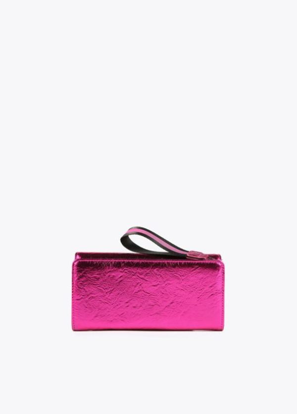 Billetero grande metalizado con logo grabado en parte frontal. Cierre con cremallera y botón clic. Detalle asa de mano.