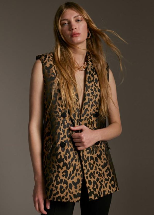 Chaleco recto en estampado animal print. Cuello solapa y hombreras. Botones centrales y tapetes laterales.