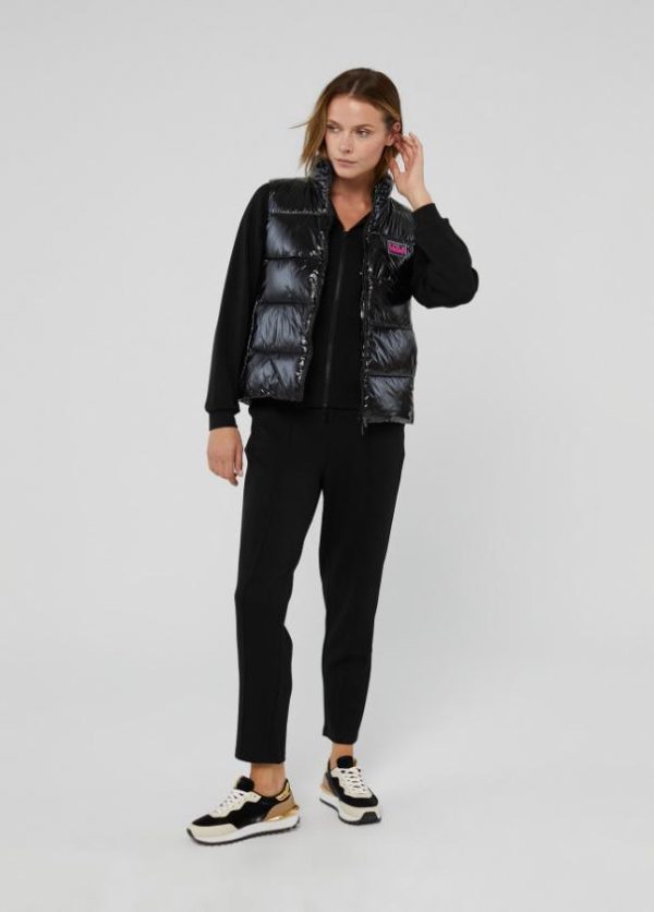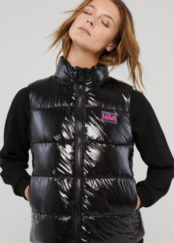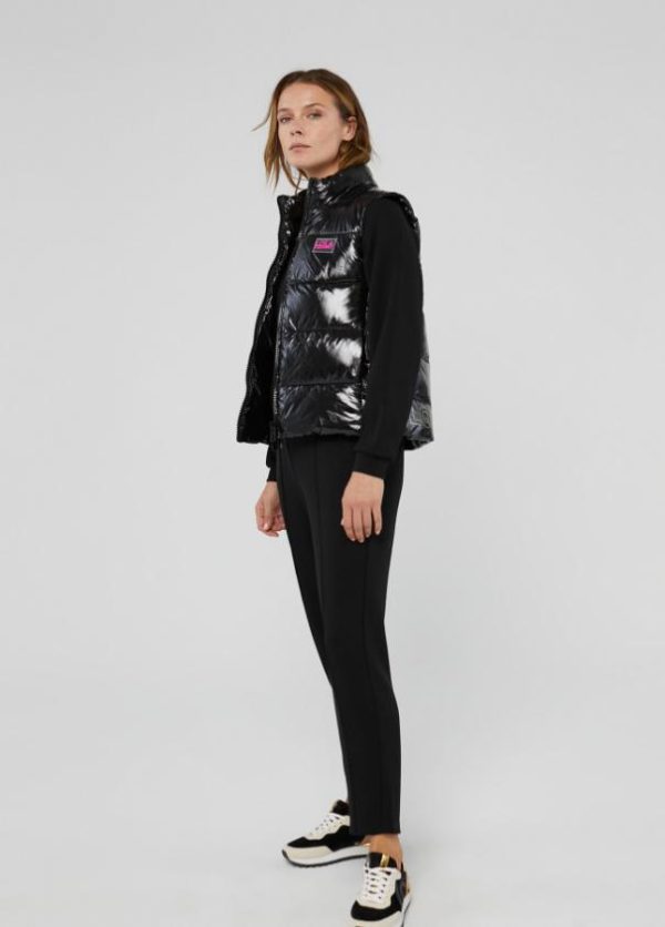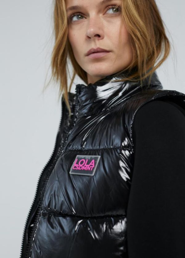 Chaleco corto acolchado en efecto charol. Cierre con cremallera de doble carro a tono. Bolsillos laterales y logo serigrafiado en bajo espalda.
