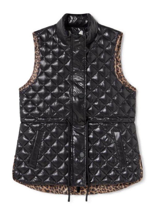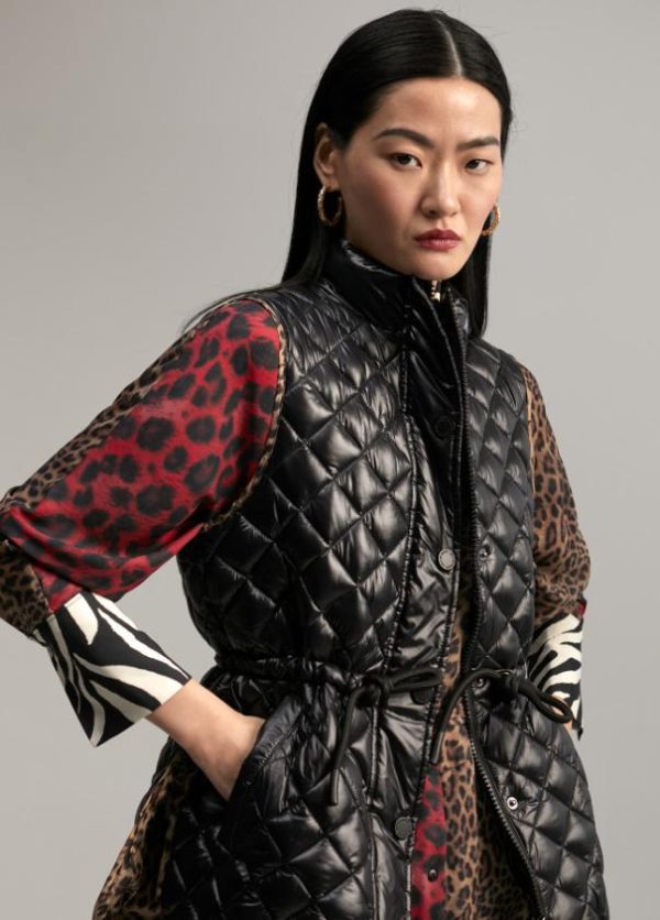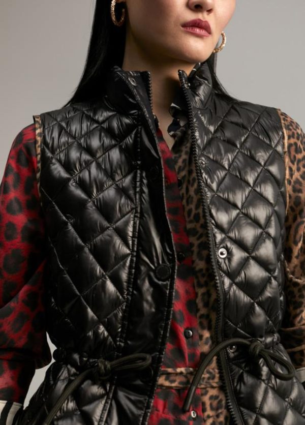Chaleco acolchado efecto charol. Cerrado con cremallera y remaches metálicos. Fruncido en cintura. Bolsillos laterales. Detalle de animal print en vivos y forro.
