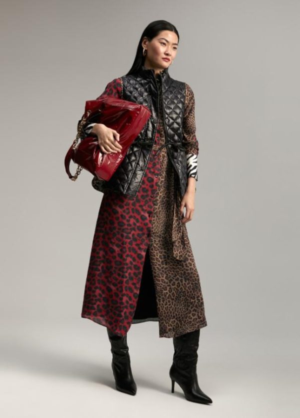 Chaleco acolchado efecto charol. Cerrado con cremallera y remaches metálicos. Fruncido en cintura. Bolsillos laterales. Detalle de animal print en vivos y forro.
