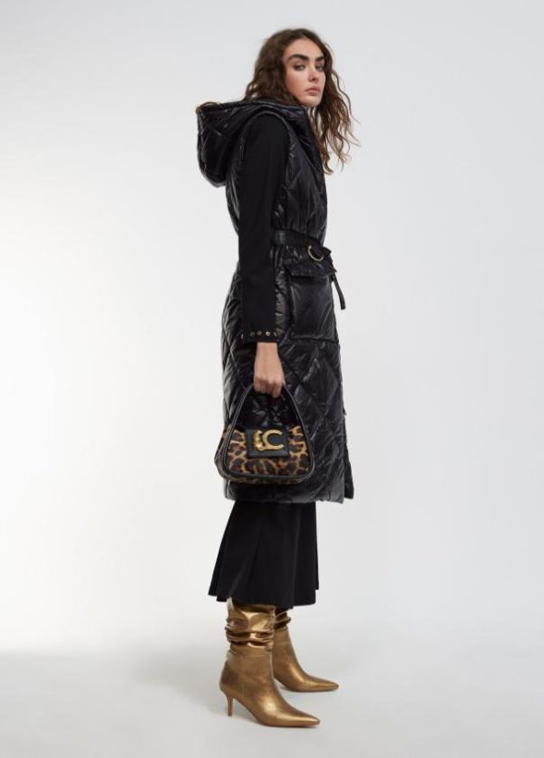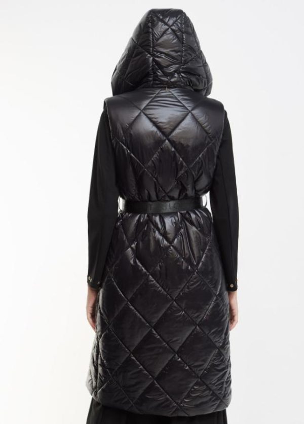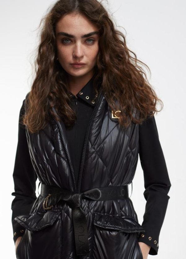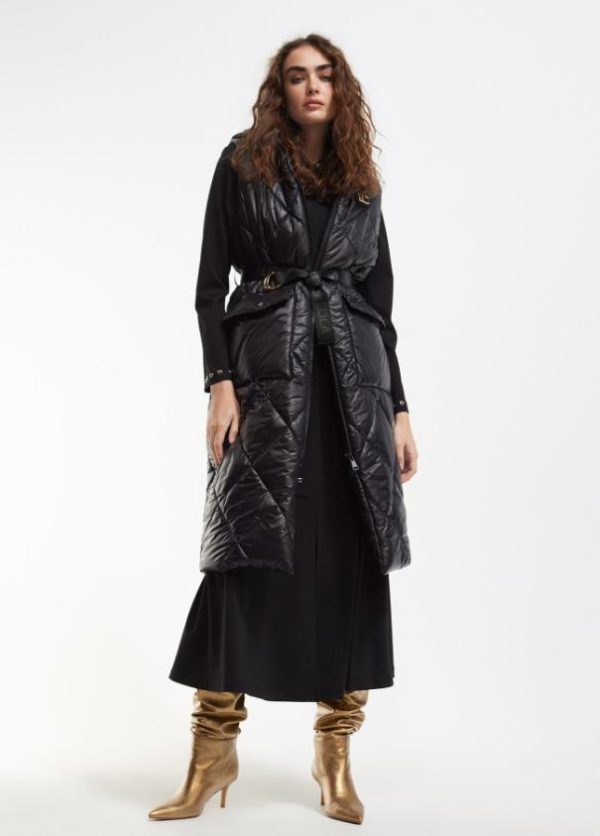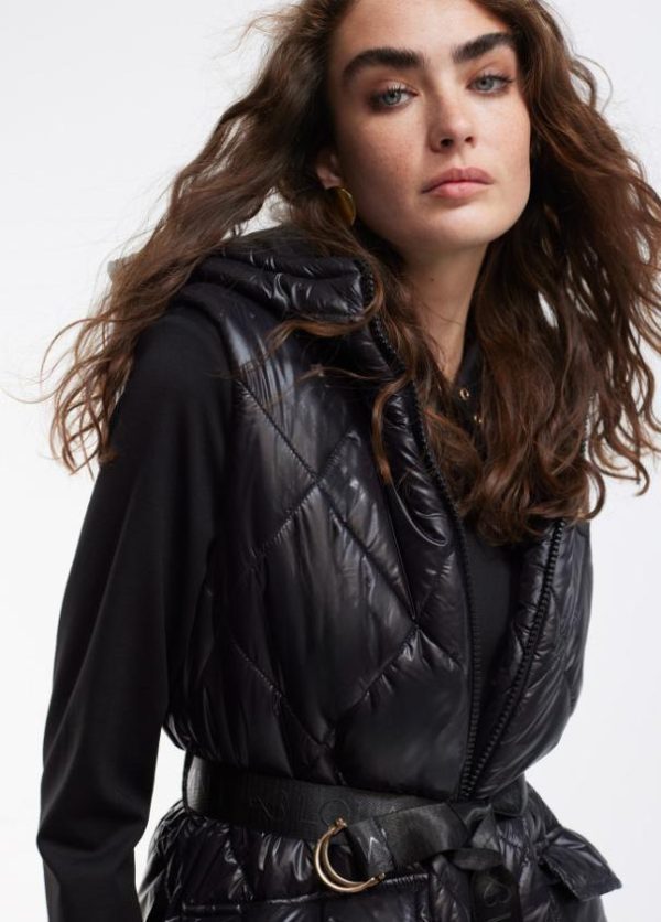Chaleco largo acolchado con capucha. Bolsillos plastrón con tapete en parta inferior. Cinturón logotipado a tono con hebilla metálica. Cierre con cremallera de doble carro.