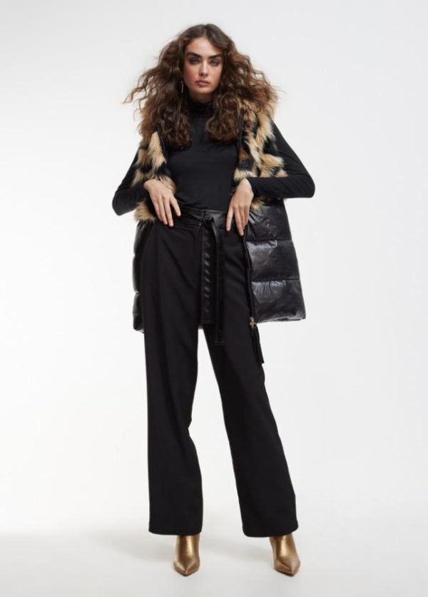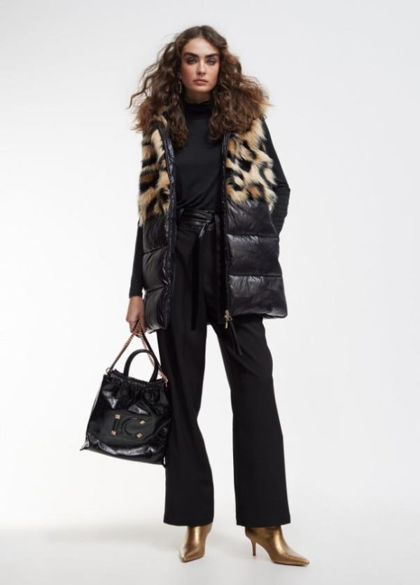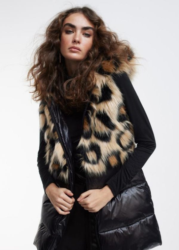 Chaleco con capucha. Pelo estampado animal print en frontal superior y capucha. Cierre con cremallera de doble carro con tirador logotipado. Bolsillos laterales.