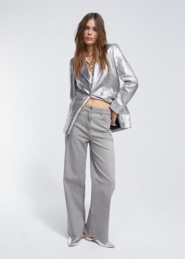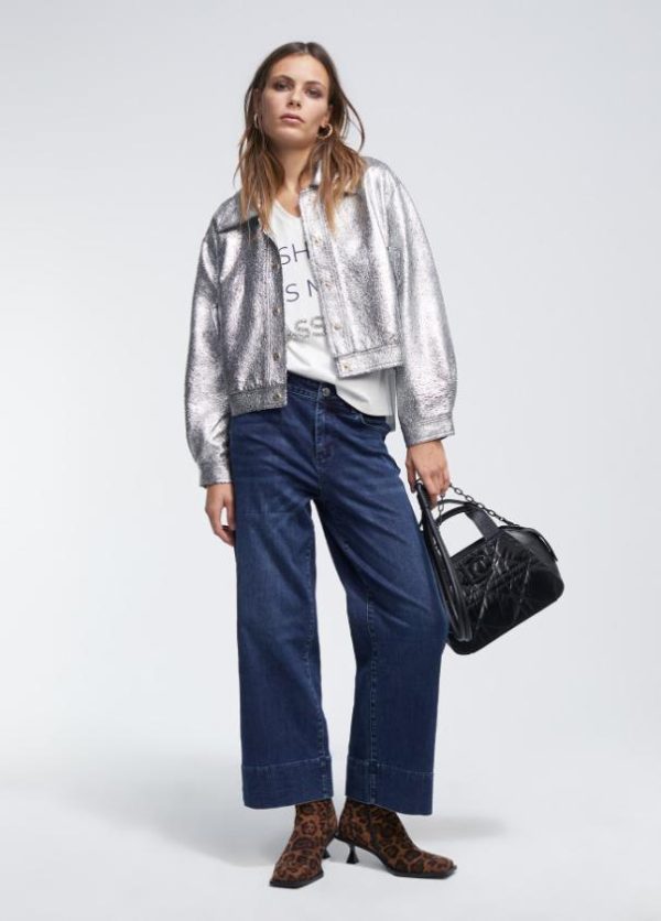 Chaqueta bomber en tejido craquelado plata. Cierre con snaps metálicos en dorado en frontal y puños. Bolsillos laterales con tapete y snap.