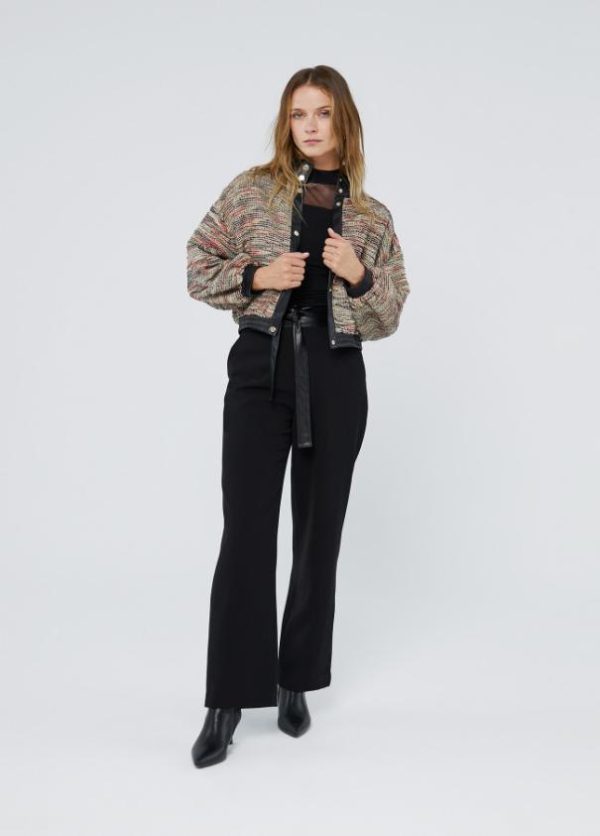Bomber en tejido tweed combinada con detalles en efecto piel. Cierre con snaps metálicos. Manga ligeramente abollonada y recogida en puño.