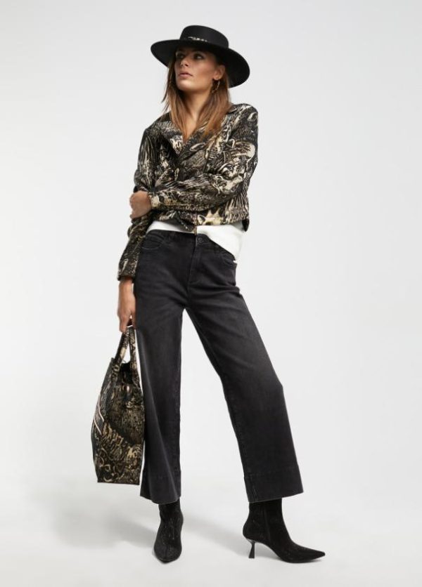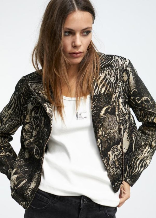 Chaqueta corta en tejido jacquard de estampado animal. Cuello solapa y cierre frontal con cremallera metálica. Detalle de espalda en contraste.