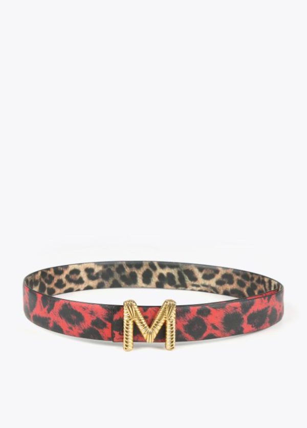 Cinturón reversible animal print en dos tonos, rojo y marrón. Letra logo dorada y grabada a modo de hebilla.