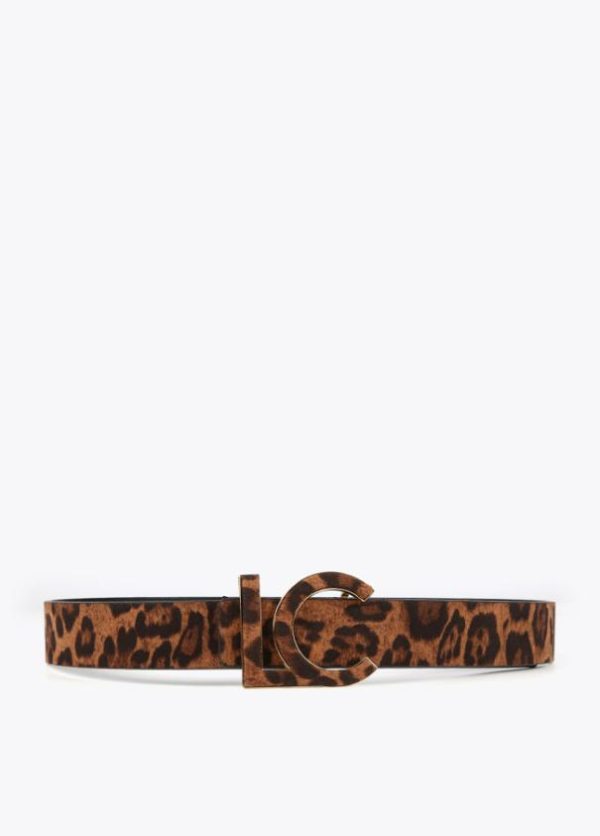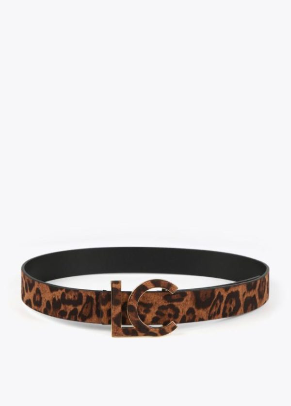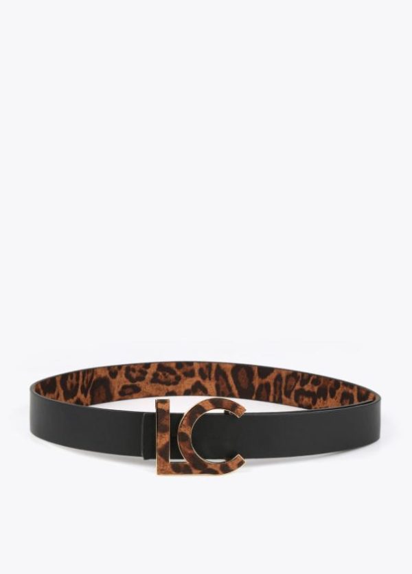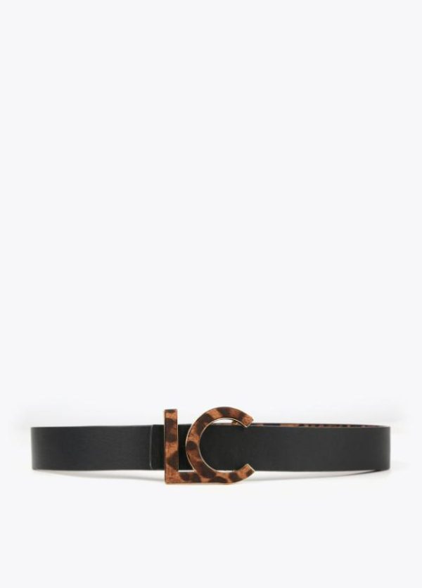 Cinturón en efecto piel reversible animal print y negro. Letras logo forradas en animal print a modo de hebilla.