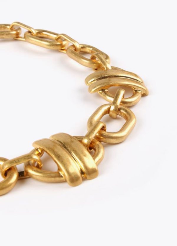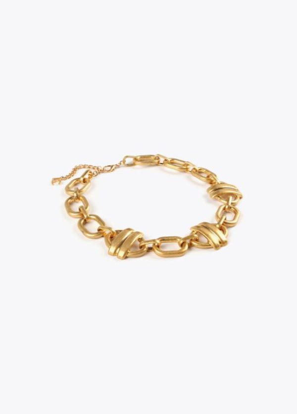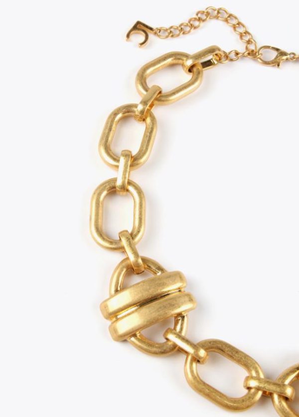 Collar estilo gargantilla dorado combinado con eslabones metálicos y cadena. Cierre ajustable.