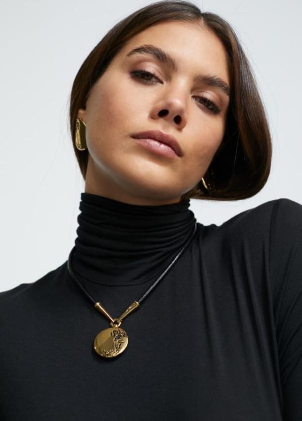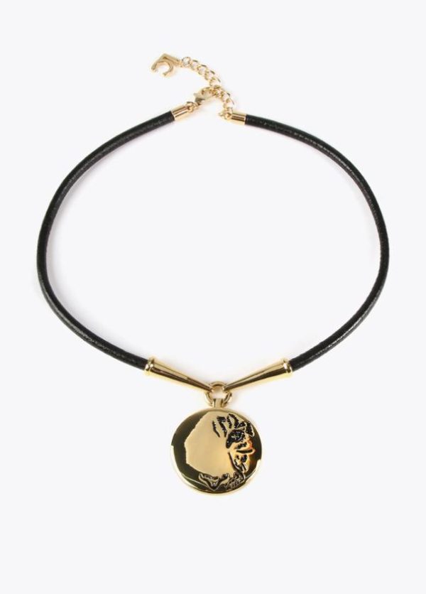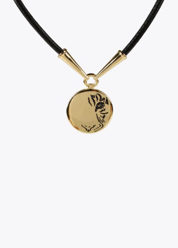Collar tipo gargantilla de cordón negro con detalles dorados y medalla con grabado tigre.