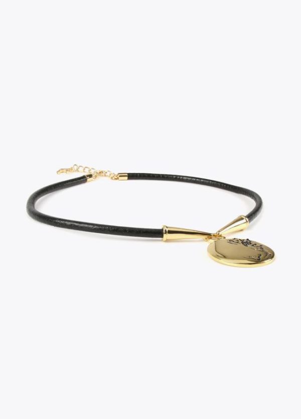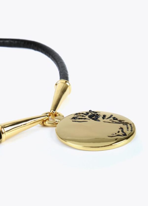 Collar tipo gargantilla de cordón negro con detalles dorados y medalla con grabado tigre.