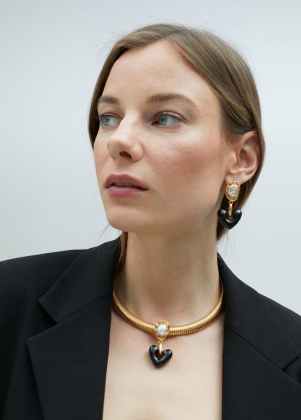 Collar dorado tipo gargantilla elástica con colgante corazón color negro con maxi piedra efecto perla.