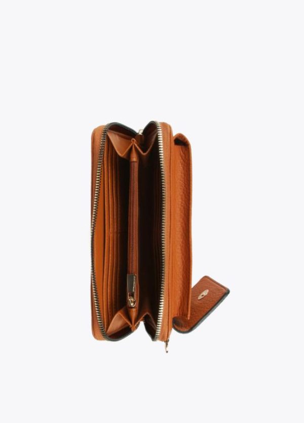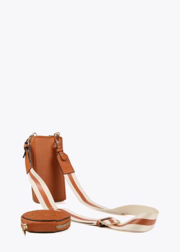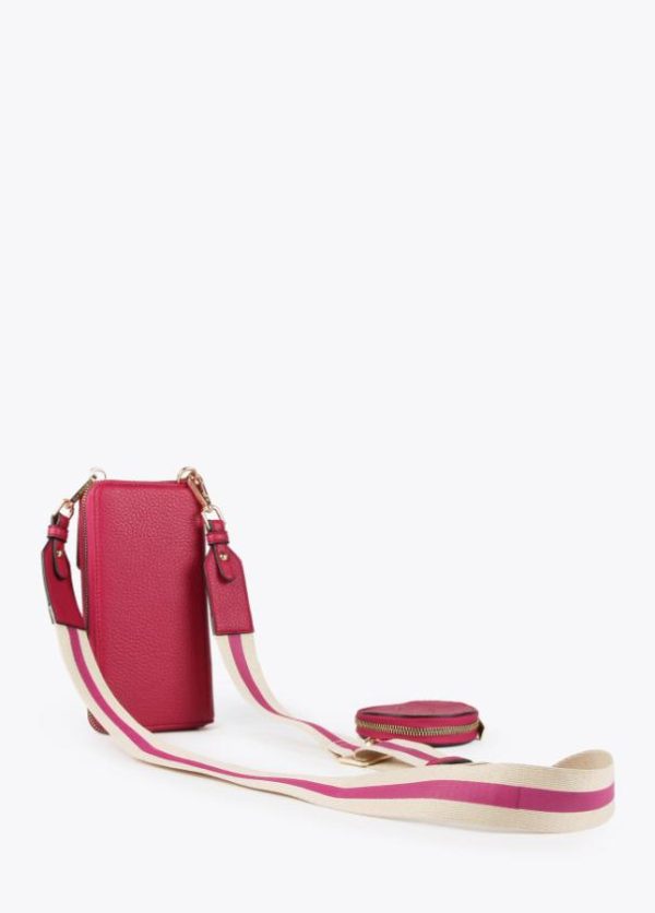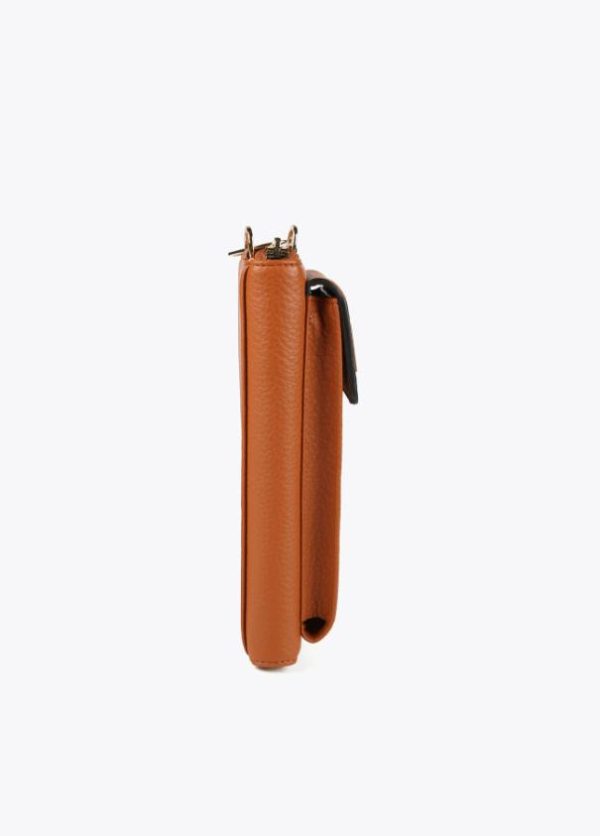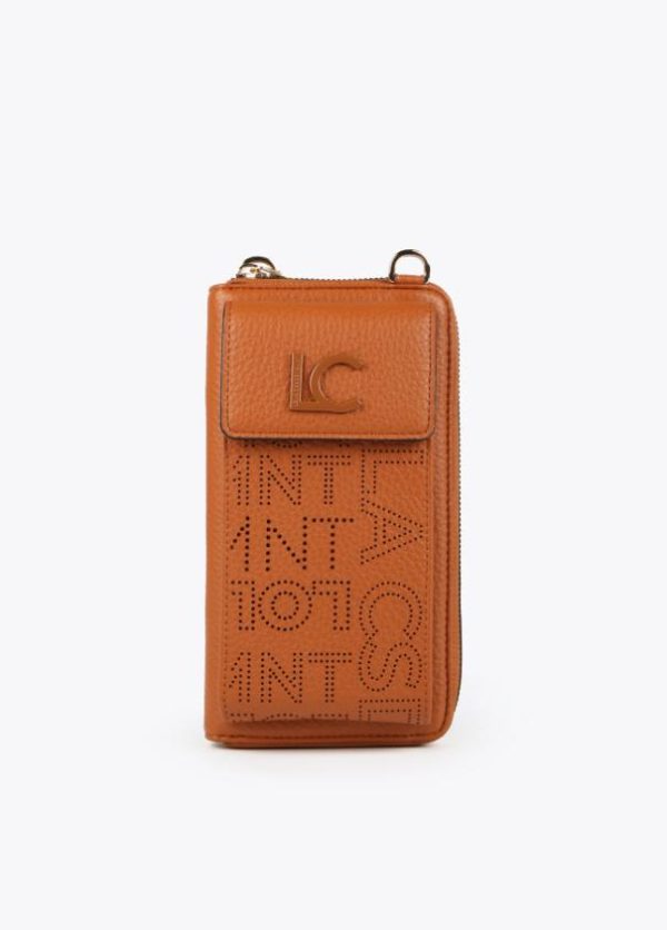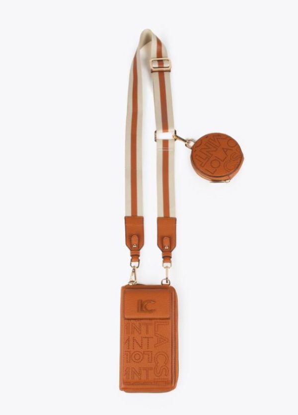 Monedero y bolsito para el móvil con logotipo troquelado y asa bandolera ajustable y extraíble. Detalle monedero en asa bandolera.