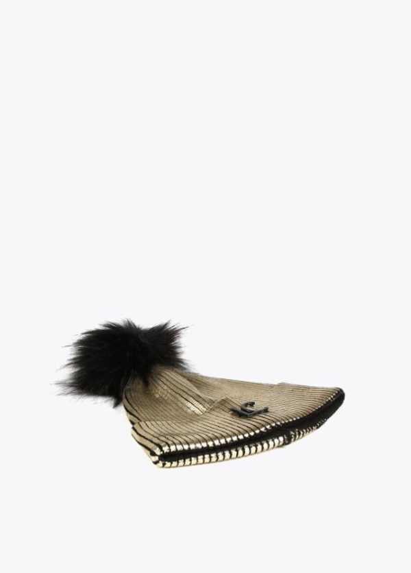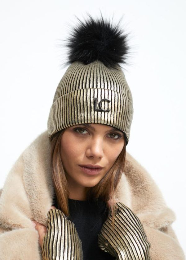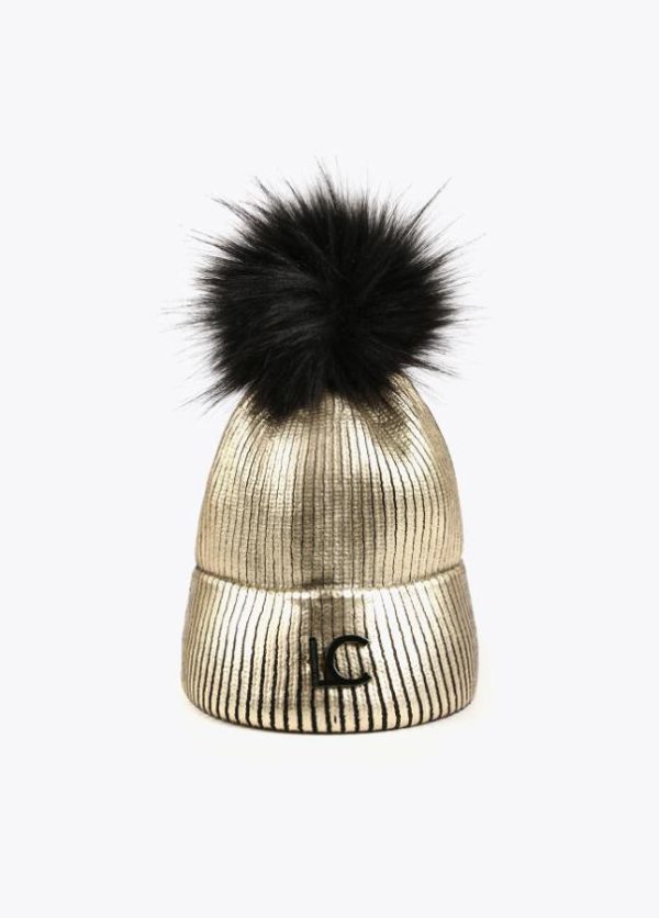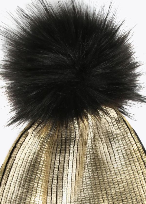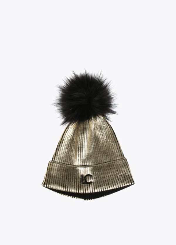 Gorro de tricot dorado con maxi pompón efecto pelo y letras logo lacadas en parte frontal.