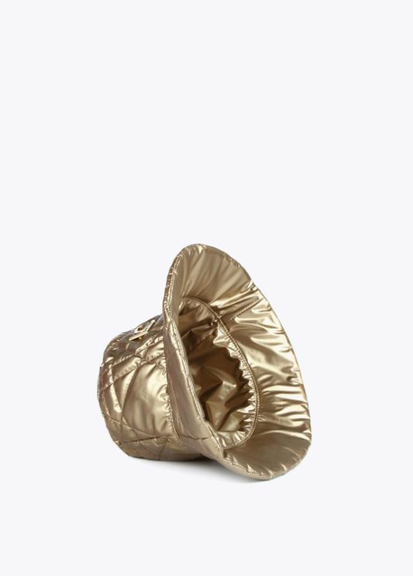 Gorro tipo bucket acolchado en nylon brillante y logo dorado en parte frontal.